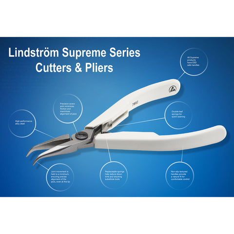 Traditional Lindström Supreme cutters and pliers provide great performance in applications like general electronics assembly, fine mechanical work and precise wire bending. The Supreme Series features a precision screw & nut in an advanced lap joint design. Joint play is held to a minimum, ensuring precise alignment of the jaws even at the tips. Supreme Series oblique end cutters are preferred by jewelry and wire artists, while transverse cutters are uniquely suited to trimming leads in hard-to-reach assemblies.