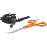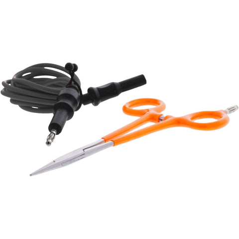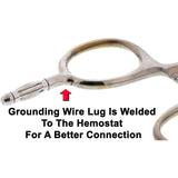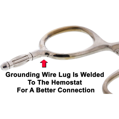 These hemostats are supplied with a 1.5m long, 16-gauge copper replaceable wire. Being this heavier gauge, provides for a stronger wire being less likely to break and it allows for maximum current to travel through it giving you a better weld than finer wire. The grounding wire is attached to the hemostats via a lug that is welded on for maximum strength and best conductivity.