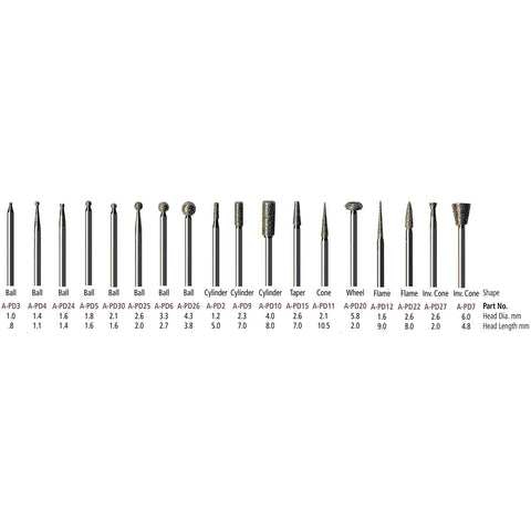 A-PD10 – Cylinder, A-PD11 – Cone, A-PD12 – Flame, A-PD15 – Taper, A-PD2 – Cylinder, A-PD20 – Wheel, A-PD22 – Flame, A-PD24 – Ball, A-PD25 – Ball, A-PD26 – Ball, A-PD27 – Inv. Cone, A-PD3 – Ball, A-PD30 – Ball, A-PD4 – Ball, A-PD5 – Ball, A-PD6 – Ball, A-PD7 – Inv. Cone, A-PD9 – Cylinder |
