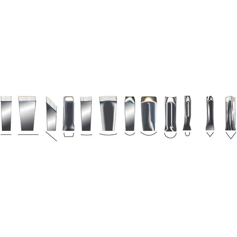 Kit includes canvas pouch and the following twelve chisels: A-KC501, A-KC502, A-KC503, A-KC504, A-KC505, A-KC506, A-KC507, A-KC508, A-KC509, A-KC510, A-KC511, A-KC515