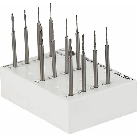 This is a set of 12 bits 0.5mm - 1.6mm in a case. These Panther Brand polished steel twist drills have a 3/32 Inch uniform shank that can be used in a quickchange flexshaft handpiece without an adapter. The drills are approximately 1-3/4 Inch long. Made in Germany. Panther has earned a reputation for the highest standards in precision tool production in the world. Their burs and tools are manufactured on the most technically advanced computer assisted machinery in existence. Only the finest quality hardened tool steel is used. Each tool is individually hand inspected before leaving the factory. Their highly trained technicians take pride in producing the most exceptional, durable precision burs available anywhere. Once you experience the performance of a Panther bur, you will never accept a substitute.