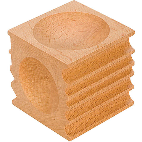 Made of hardwood and hand sanded to a smooth finish. Use this 2-¾ block when working with fine or soft metals and marring could be an issue. - Four round depressions: 2-¼ 2-1/8 1-7/8 and 1-¾ diameters. - Five “Uin. channels. - Two 90 Deg. channels. - Two 45 Deg. grooves.